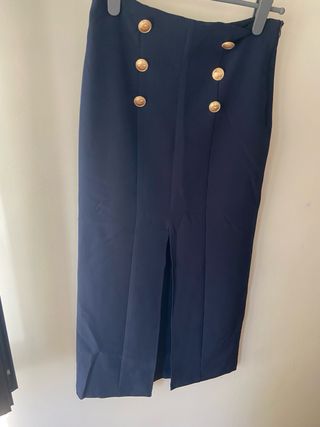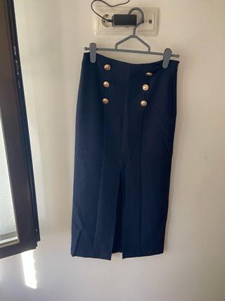 Preciosa falda midi de estilo marinero. Es una prenda elegante y versátil, ideal para cualquier ocasión. - Diseño entallado. - Abertura frontal. - Botones dorados decorativos.