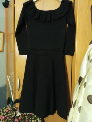 Elegante vestido negro de Zara con un detalle de volantes en el escote. - Manga larga. - Cintura marcada. - Falda con vuelo.