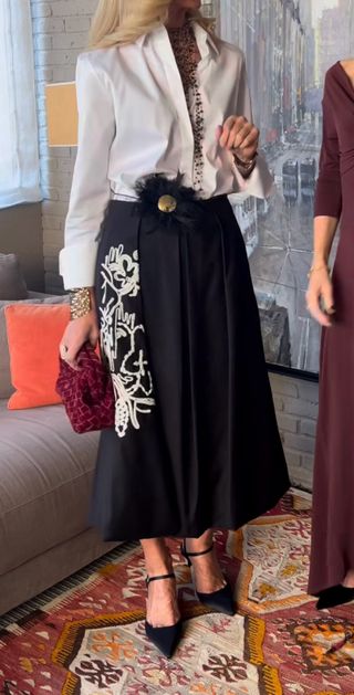 Falda midi de tiro medio con cintura desflecada y pliegues. Detalle de bordado lateral a contraste. Bajo acabado en volumen. Cierre con cremallera oculta en costura. Negro super elegante y estilosa