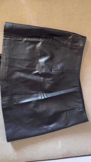 Preciosa falda negra de cuero sintético, ideal para cualquier ocasión. Está en perfecto estado y lista para lucirla. - Falda corta con cinturón. - Cierre de cremallera lateral. - Diseño moderno y elegante. - Bolsillos laterales con cremallera.