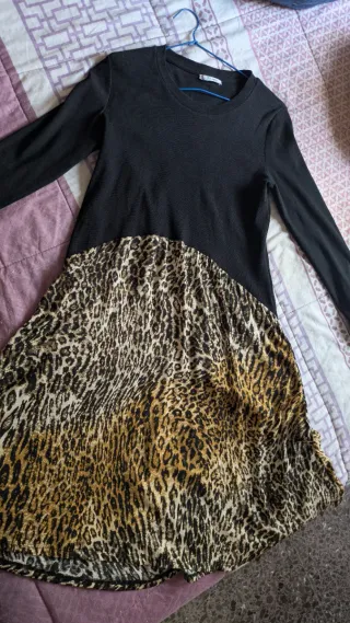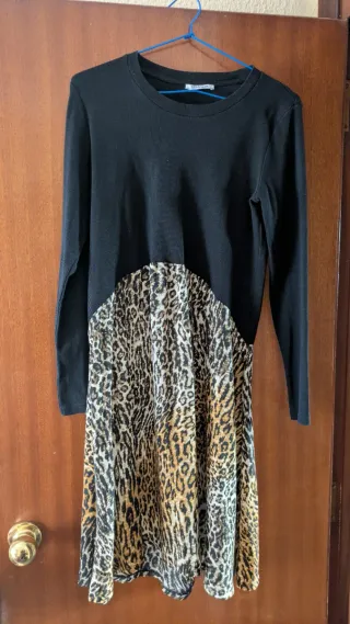 Vestido midi de Zara con la parte superior negra y la falda con estampado de leopardo. Usado pero bien conservado, hace cuerpo muy bonito al tener las dos partes diferenciadas por la cintura. - Manga larga. - Cuello redondo. - Diseño combinado - Parte superior de algodón, parte de la falda tela suave tipo raso.