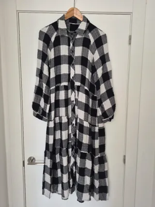 Vestido largo de Zara con estampado de cuadros. - Diseño camisero. - Manga larga. - Volantes en la falda.