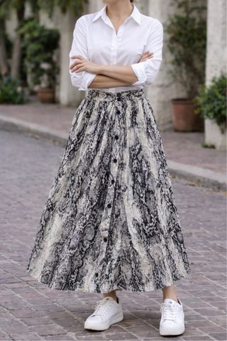 Falda larga con estampado animal print de Zara. Diseño con botones frontales y cintura marcada. Cintura: 36 cm (no elástica) Largo: 80cm - Estampado de serpiente en tonos beige y negro. - Largo maxi. - Cierre de botones. - Cintura alta.