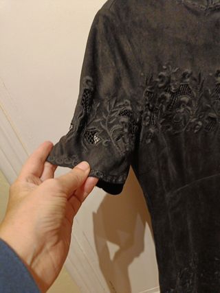 Sin estrenar, de tela aterciopelada y sienta muy bien por estar patroneado con pinzas. Decorado con encaje calado. Falda encima de las rodillas Ideal como fondo de armario y para combinar con mucho tipo de complementos. Estilo formal, para eventos discretos.
