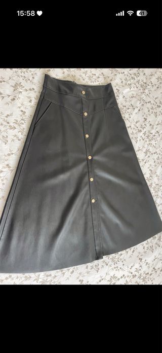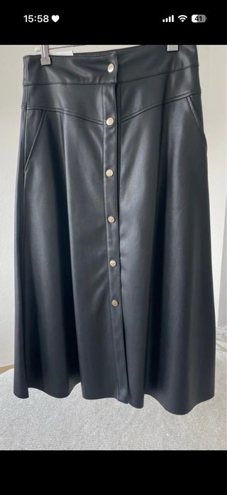 Falda midi de polipiel negra de Zara, a estrenar. - Diseño con botones delanteros. - Cintura alta. - Bolsillos laterales. Medidas : 36 cintura 72 largo