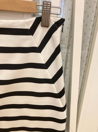Preciosa falda midi de rayas de Zara. Fondo blanco y rayas negras. Tejido elástico y cierre con cremallera lateral. Corte ajustado a la silueta. Solo se ha usado una vez. Medidas: cintura 38 cm, caderas 44 cm, largo 58 cm