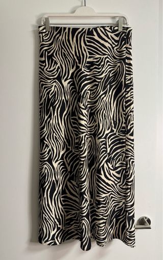 Falda larga satinada con estampado de cebra. - Diseño fluido y elegante. - Tejido satinado con caída. - Estampado de cebra en blanco y negro.