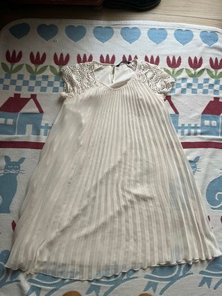 Elegante blusa de Zara con detalles de encaje y falda plisada. - Diseño con cuello redondo y manga corta. - Tejido ligero y vaporoso. - Cierre en la espalda. Talla 44 Se recoge también en Madrid