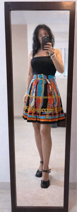 Falda plisada de Zara con un llamativo estampado de cadenas y colores vibrantes. - Diseño plisado. - Cinturón con hebilla dorada. - Estampado inspirado en pañuelos. Falda Zara con estampado de cadenas estilo pañuelo en tonos rojo, azul, negro y dorado. Diseño muy favorecedor, con vuelo y cintura marcada. ✨ Detalles: • Marca: Zara • Talla XS • Estampado cadenas / scarf print / barroco • Incluye cinturón a juego • Cintura alta • Falda con vuelo, queda preciosa puesta • Tejido ligero y cómodo 📌 Estado: muy poco uso, en perfecto estado. Ideal para looks de verano, eventos, cenas o combinar con top básico o blusa. 💬 Descuento