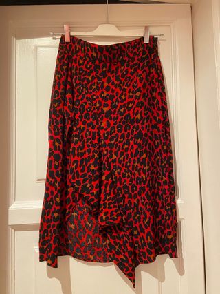 Falda midi en color rojo vivo con estampado leopardo (animal print), de Zara Basic. Talla M. Ligeramente entallada, preciosa, con volante frontal. Se encuentra nueva sin etiqueta. Longitud total: 67 cm. Cintura en plano: 37 cm. #faldamidi #faldaleopardo #animalprint #estampadoanimal #animalprintskirt #animalprintzara #saiavermelha #saiamidi #jupeleopard #jupeanimalprint