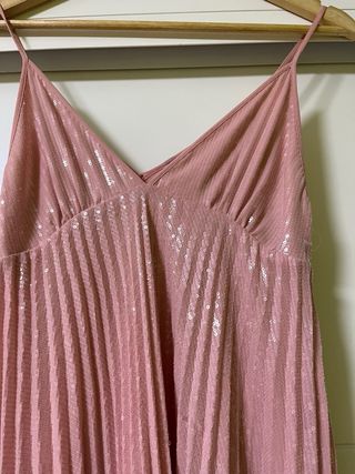 Vestido largo de lentejuelas en color rosa. - Diseño con tirantes finos. - Falda plisada. - Acabado brillante.