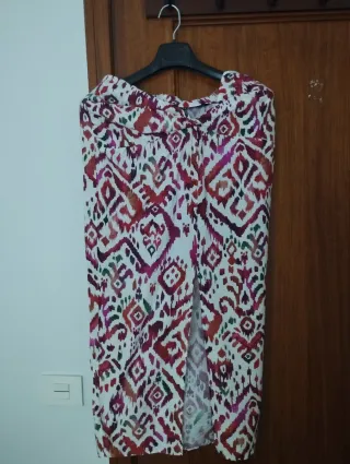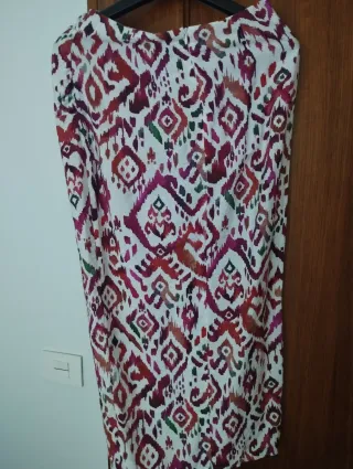 Falda sin estrenar, con un tejido que sienta de maraviila, tiene mucha caída, ajustado en la parte de arriba y más ancho por debajo, con mucho movimiento. Tiene un estampado étnico, muy combinable. En la cintura tiene goma, pero NO muy elástica, es muy cómoda. Precio original 59 euros.