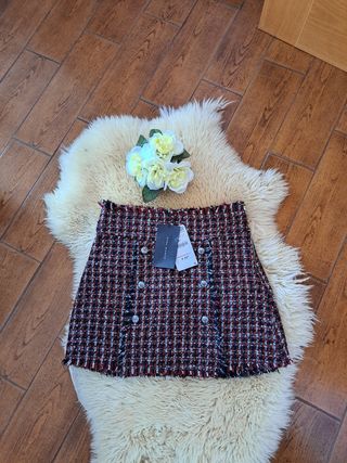Falda de Zara a Estrenar con Etiquetas talla S, cintura ancha, tabla central con detalle de 6 botones, se abrocha a un lado con cremallera, pequeñas pinzas zona trasera, el acabado en flecos, queda súper chula puesta