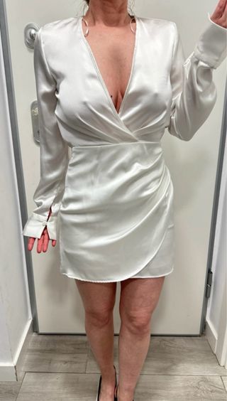 Elegante vestido blanco de satén con un diseño cruzado. - Manga larga. - Detalle de drapeado en la falda. - Cierre con botones en los puños.