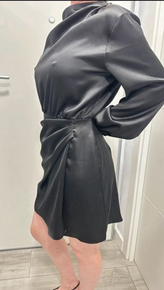 Elegante vestido negro de Zara con un diseño drapeado. - Escote pronunciado en V. - Tejido con textura acanalada en la parte superior. - Mangas cortas tipo murciélago. - Corte asimétrico y fluido en la falda.