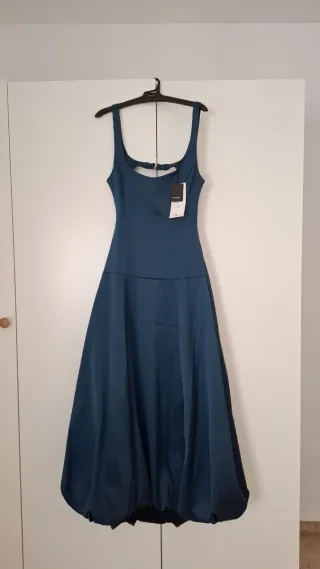Vestido midi de color verde pato con un diseño de globo. - Nuevo con etiqueta. - Espalda al aire. - Falda tipo globo - Talla S.