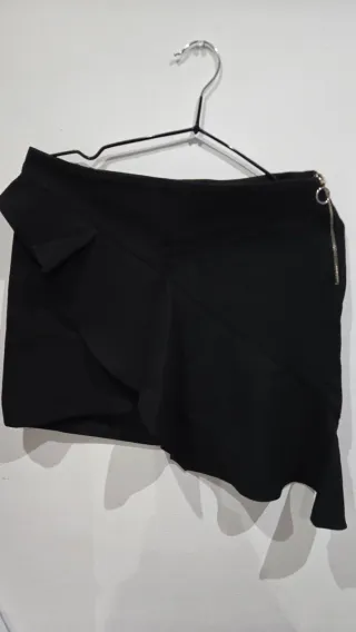 Falda corta negra con un diseño moderno y detalles únicos. - Volantes asimétricos en la parte delantera. - Cremallera lateral con detalle de anilla. - Corte favorecedor.