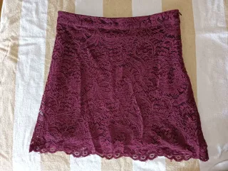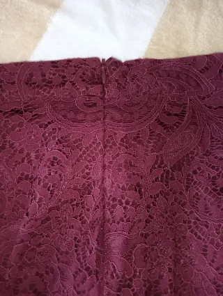 Elegante falda de encaje en tono burdeos, con un diseño intrincado y delicado. - Tejido de encaje con motivos florales. - Bajo con acabado festoneado. - Cremallera lateral oculta.