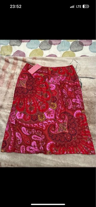 Falda con un bonito estampado paisley en tonos rojos y rosas. Es una prenda nueva con etiqueta. - Diseño llamativo. - Corte que favorece la figura.