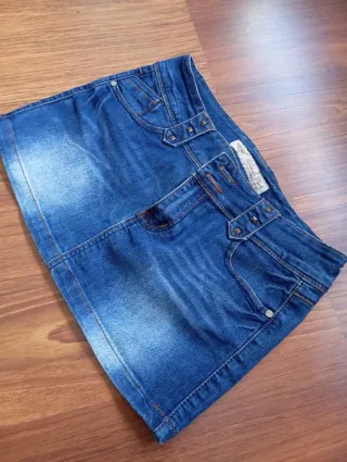 Mini falda vaquera en perfecto estado. - Diseño moderno. - Detalle de tachuelas en los bolsillos. Pone talla XXL, pero yo diría más bien que es una M, cae a la cadera.