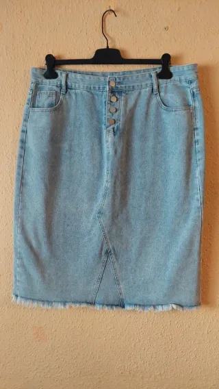 Falda vaquera de corte recto y largo hasta la rodilla. Presenta un diseño con botones en la parte frontal y un acabado deshilachado en el bajo. - Cierre de botones. - Bajo deshilachado. - Bolsillos delanteros. Hay fotos con las medidas Hago envíos