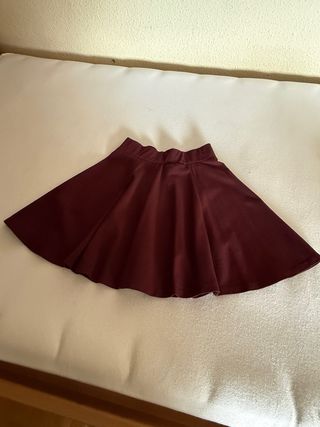 Falda corta de Stradivarius en color burdeos. Lleva detalles calados en el bajo. La cintura es elástica. Es de Stradivarius talla L