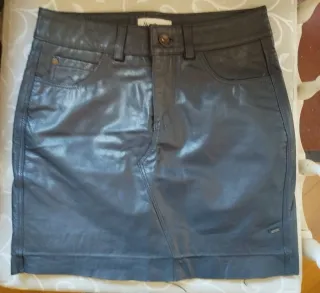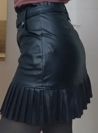 Falda corta de polipiel con un diseño moderno. - 41'5 cm largo - Cintura con trabillas. - Bolsillos delanteros. - Cierre de cremallera y botón. - Detalle metálico en el lateral.