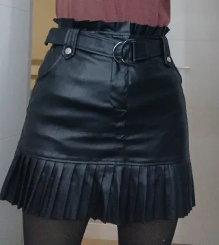 Falda corta de estilo moderno, con un diseño que combina un corte recto en la parte superior con un volante plisado en la parte inferior. La cintura es alta y fruncida, e incluye un cinturón. - Material: efecto piel. - Cintura alta fruncida. - Incluye cinturón con hebilla. - Detalle de volante plisado en el bajo.