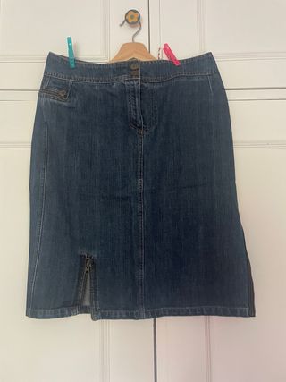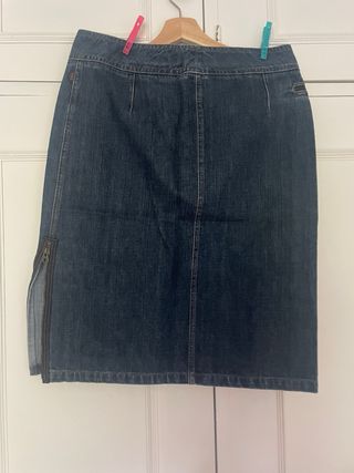 Falda midi de corte recto en tejido vaquero. Talla 25, mide 35cm de cintura - Diseño clásico de cinco bolsillos. - Abertura trasera central. - Detalle de pespuntes característicos.