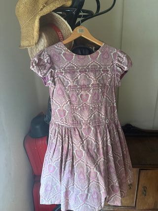 Vestido de niña con un bonito estampado. - Diseño con mangas cortas abullonadas. - Cintura marcada con detalle de pliegues. - Falda con vuelo. - Cierre con botón en la espalda.