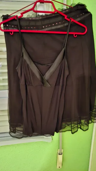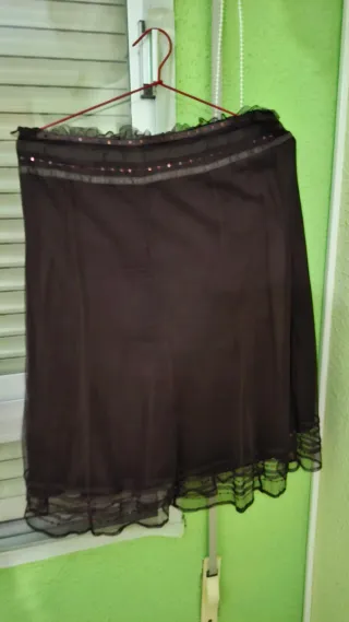 Falda elegante de color marrón con detalles de volantes y lentejuelas. - Diseño con volantes en el bajo. - Adorno de lentejuelas en la cintura y el bajo. - Tejido ligero y con caída. Regalo camiseta de tirantes !