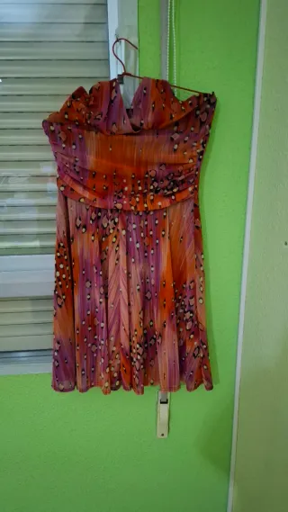 Vestido de corte strapless con un vibrante estampado. - Diseño con fruncido en la cintura. - Falda con caída. - Estampado abstracto en tonos naranjas y rosas.