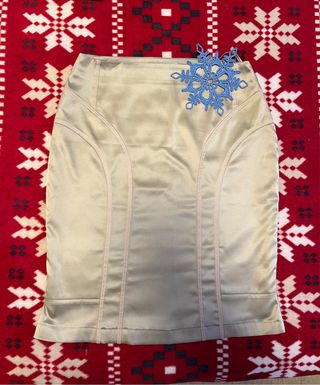 Mini falda de la marca Starry Eyed con un diseño elegante y detalles únicos. - Adorno de pedrería y detalles dorados en el bajo. - Lazada frontal decorativa. - Etiqueta de reparación incluida.
