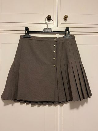 Preciosa falda corta de lana, perfecta para añadir un toque de estilo a tu armario. - Material: Lana - Color: Gris - Diseño con vuelta y botones decorativos en un lateral.