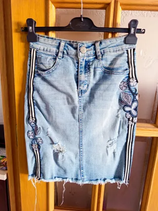 Falda vaquera de corte entubado con un diseño moderno y detalles únicos. - Diseño de corte entubado. - Detalles de bordado floral en los laterales. - Raya lateral con diseño de líneas blancas y negras. - Bajo deshilachado. - Roturas desgastadas para un look casual.