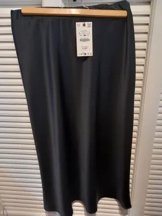 Falda midi de Zara, con un acabado satinado y elegante. Perfecta para cualquier ocasión. - Material satinado. - Corte midi. - Talla L.