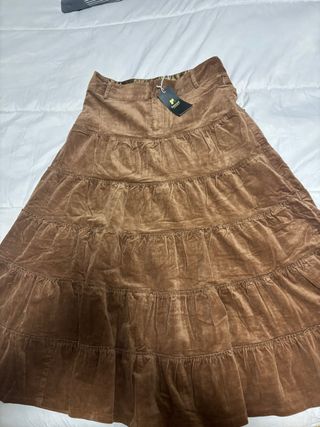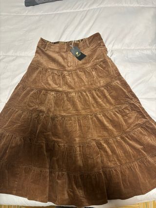 Falda larga de invierno con un diseño de volantes en varias capas. Es una prenda cómoda y versátil. - Tejido de pana. - Cintura con trabillas para cinturón. - Cierre de cremallera y botón.