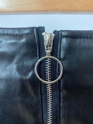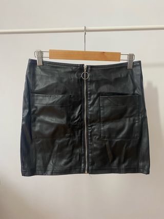 Falda de mujer con un diseño moderno y versátil. - Material: Efecto piel/cuero - Cierre frontal con cremallera. - Dos bolsillos delanteros.