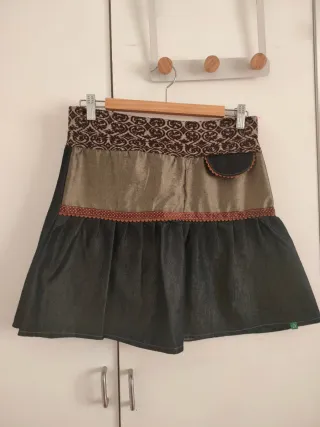 Falda tejana con un diseño original y detalles únicos. - Cintura con estampado geométrico en tonos marrones. - Panel central en tejido brillante. - Adorno de puntilla en la parte inferior. - Bolsillo lateral con forma de abanico.