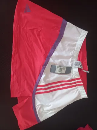 Falda corta con diseño deportivo y detalles llamativos. - Cintura elástica. - Rayas blancas verticales en los laterales. - Panel lateral morado.