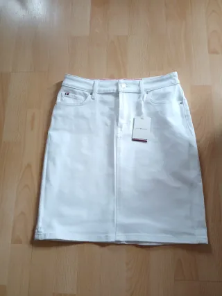Falda de la marca Tommy Hilfiger, talla 38, sin estrenar y con etiquetas. - Diseño de corte recto. - Tejido vaquero de 99% algodón 1% elastano. - Bolsillos delanteros y traseros. - Medidas: cintura 37cm, cadera 46cm, largo 47cm. - Precio negociable