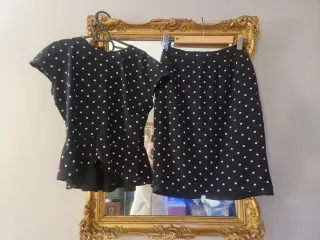 Conjunto de dos piezas presenta un diseño clásico de lunares blancos sobre fondo azul marino Una combinación atemporal que evoca un estilo retro muy elegante. Detalles de las Prendas Blusa: Es un top de manga corta tipo "cap" (manga casquillo) con un vuelo o volante en el bajo, lo que le da un toque femenino y fluido. Falda de corte recto o ligeramente evasé de largo midi, diseñada para ajustarse a la cintura y crear una silueta estilizada.