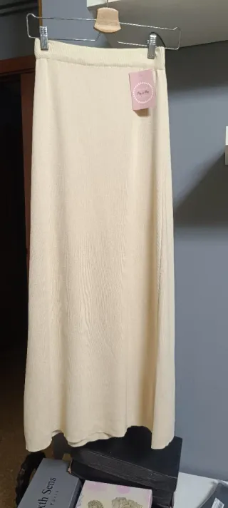 Falda larga de viscosa en color beige, talla S/M. Es una prenda cómoda y versátil. - Tejido de viscosa. - Corte recto y largo. - Cintura elástica.