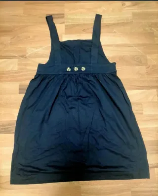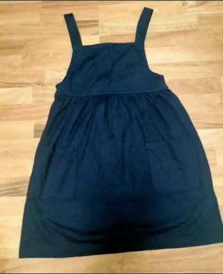 Vestido azul marino con un diseño moderno y práctico, perfecto para cualquier ocasión. Talla M. Ideal para llevarlo con una camiseta debajo. - Diseño con tirantes anchos. - Cintura marcada con fruncido. - Dos bolsillos frontales. - Falda con vuelo.