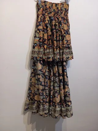 Falda asimétrica, corta delante y larga por detras con un bonito estampado floral y estilo bohemio. Perfecta para un look casual y veraniego. - Diseño de volantes. - Cintura elástica fruncida. - Estampado multicolor sobre fondo negro. - Comprada en Nunu Santander 70% De Seda 30%viscosa