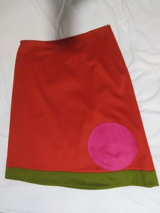 Falda de la marca Jocomomola con un diseño llamativo. - Color base naranja vibrante. - Detalle de un círculo rosa aplicado. - Banda inferior en color verde. - Forrada - 80% lana, 20% Nailon