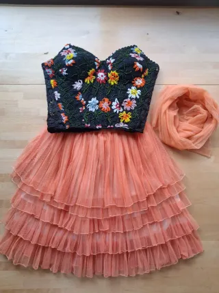 Conjunto de corpiño y falda con un diseño floral. - Corpiño con bordado de flores multicolores de cuentas - Falda de tul con volantes en capas.