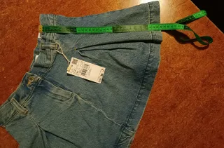 Falda pantalón tejana con un lavado grisáceo y detalles de botones. - Diseño de cinco bolsillos. Solo 2 funcionales, los de atrás. - Cierre de botones en la parte delantera. - Cintura con trabillas para cinturón. 🌀Tejano elástico talle alto son cortos. Talla 12 pero como 32 fuerte sujeción. No envio por correos solo puntos pack( en persona consultar. Entrega) NUEVA FALTA ETIQUETA.