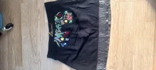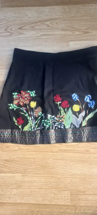 Falda corta negra de la marca Desigual con un bonito bordado floral. - Diseño con flores bordadas en varios colores por los dos lados.