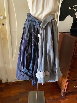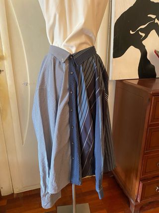 Original falda confeccionada a partir de camisas. - Diseño patchwork con diferentes rayas. - Tono azul y multicolor. Se puede ajustar la cintura con un cinturon o corbata